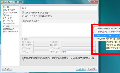 このように「USBデバイス フィルタ」に選択したデバイスが追加される。この状態でOKをクリックしてゲストOSを起動させると、接続したUSB機器がゲストOSでも認識されるようになる。