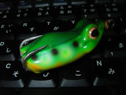 これ自体は最近釣具屋さんでよく見かけるバス用のカエルなのだが、ジッターバグもどきのカップがついている。世間では「ナマズ=ジッターバグ」の法則?があるのだが、実際に昼間に見えているナマズを狙ってみると、音に対して思いっきり反応しているのと違うか?と感じることがたびたびある。なので、ノイジータイプのカエルでナマズを狙うというのは正解なのだろう。